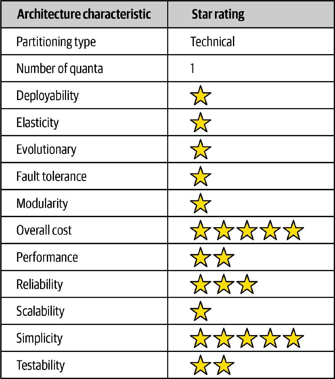 Elasticity、Fault tolerance、Scalability这些都是单体架构天然的劣势,自然地,分层架构在这些方面得分都很低。另外,sinkhole反模式的存在也拉低了分层架构在Performance上的得分。