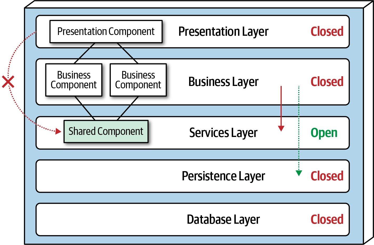 一种解决方法是,新增一个服务层,该层包含了业务层的这些共享组件。因为业务层是关闭的状态,故表现层也就不能访问到这些共享组件了。然而,新增的服务层必须置为开放状态,否则业务层将无法直接访问持久层。新增一个服务层并置为开放状态,这样既落地了架构决策,也不会影响到原有的功能,一举两得。