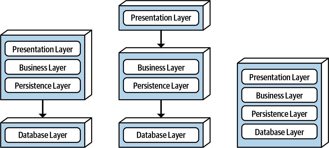 前文所述的表现层等4个层次都是逻辑的划分方法,在实际部署时,一般会有下图所示的几种部署形态。形态1中,表现层、业务层和持久层为一个部署单元,而数据层则单独部署,具体表现为一个独立部署的数据库或文件系统;形态2中,表现层被分离出单独部署,业务层和持久层组成一个部署单元,数据层依旧是单独部署的数据库或文件系统;形态3中,包括数据层在内的4层全都在同一个部署单元内,常见于业务简单的系统,它们往往使用的是嵌入式数据库或内存数据库。