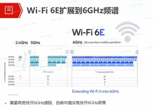 美国在今年的4月23号专门颁发了WiFi里面的6G频谱,它的频谱是5925M到7125M,整整1.2G频谱。这样的话美国它在3G到6G的频谱被国防部占了。我国针对5925到7125,我们是想把它作为5G的扩展频谱,以及未来6G的频谱这样去对待。到时候美国会发现审时度势,发现他的5G频谱选择失败,国防部不会让。6G我们也没有产业,他干脆就把这个频段发给美国所处的WiFi 6E。在未来全球的应用市场当中,WiFi 6E把全球的频谱得到了大规模的升温之后,如果全球跟着我走,那我把这个频段就占到了。那么未来中国和欧洲要去发展WiFi六E这段6G的频谱的话,美国就得了先机。未来在国内所上的WiFi 6可能不支持WiFi 6E。WiFi 6E的E是指什么特点呢?这个就是WiFi 6的扩展频谱,它需要支持5925到7125,1.2G赫兹。