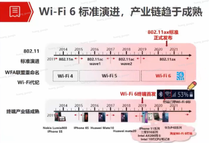 WiFi最主要的是由美国组成的专利形成的。那么我们在WiFi6里面,中国厂家阵营也充分地参与进去了。WiFi它的典型比较专业的就是大家看到的WiFi标志,那标志里面比较专业一点呢?就是大家会看到是Wi-Fi,WiFi联盟2000年改名成WiFi联盟的,以前呢叫的名字比较专业,802.11、802.11n、802.11g、802.11b等等,都是在不同阶段的WiFi版本。为了名字取得更加亲民一点,把它慢慢改造成了WiFi 1到了WiFi 6,那么现在就处在第六代WiFi,第六代WiFi。我们开篇呢和各位同学简单介绍过,现在运营商在宣传5G与F5G,那什么是F5G?由于室外的宏战,5G宏站它提供了100M的体验,在家庭里面的WiFi是第四代WiFi,叫802.11n。