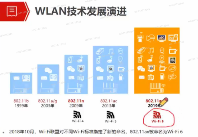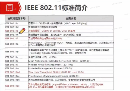 802.11技术过程当中的e指的是我们服务等级,我们可以基于各种业务流去设定它的时延、丢包、抖动、带宽。IEEE 802.11i,无线网络的安全方面的补充(2004)。IEEE 802.11ax,又称为高效率无线标准(High-Efficiency Wireless,HEW),以现行的IEEE802.11ac做为基底的草案,以提供比现行的传输速率加快4倍为目标。