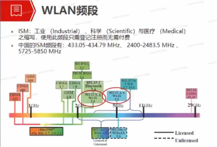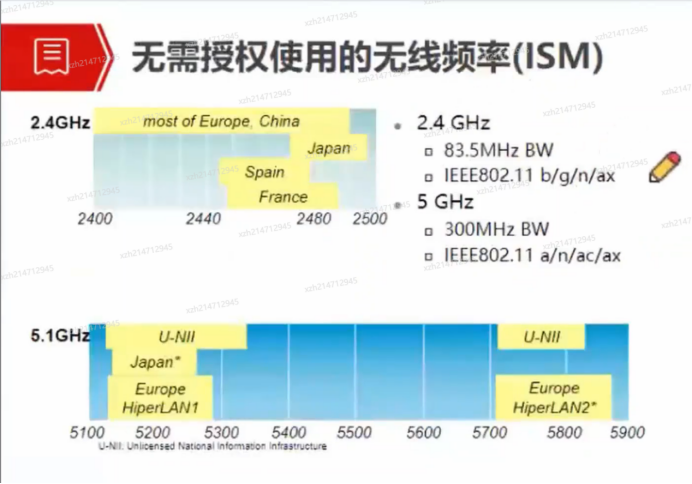 由于WiFi它是美国的,所以频谱非常宽泛,而我们中国会稍微谨慎一点,因为我们中国的人多,使在公共场景使用的频谱也多,而WiFi是一个民用频谱,它的频谱使用效率没有我们未来5G、6G频谱使用效率高,所以我们中国是比较理性的去使用WiFi。中国的ISM频段有:433.05-434.79 MHz、2400-2483.5 MHz 、5725-5850 MHz。
