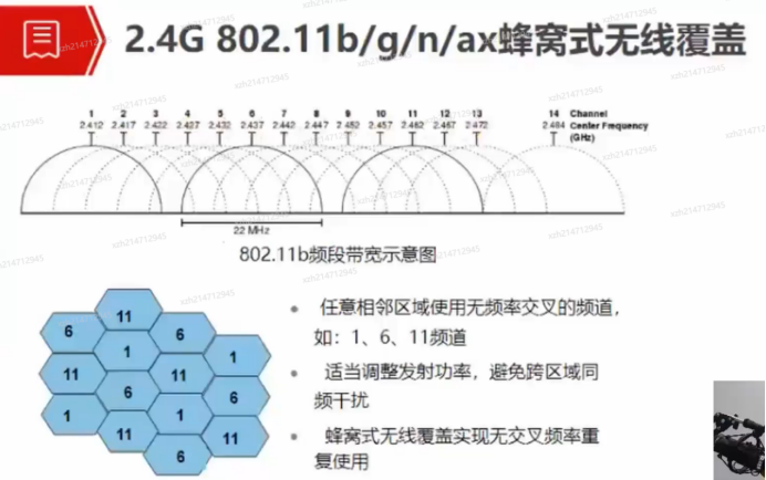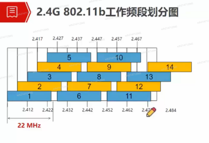 上图是给大家展示的2.4G的WiFi,每一个信道带宽是22M,我们常常用到的是最低的频段1、6、11,每个信道号的中心频率之间间隔是5M。1、6、11我们就隔五个评级,因为五个它的中心频率差25M,可以大于22M,我们需要大于等于22M,所以我们常常用的是1信道。有的同学是一个想把WiFi信号调得更好的,隔壁邻居家都是1信道,我可以调为6信道,让家里的WiFi信号更纯净一点。