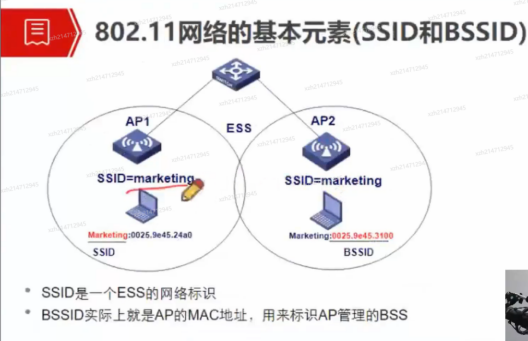 基本服务集(Basic Service Set,简称BSS)是802.11网络的基本组件,由一组相互通信的工作站所构成。BSA(Basic service area):基本服务区域,相当于一个无线单元。所谓ESS,就是利用骨干网络将几个BSS串联在一起。SSID:用户所谓的网络名称。BSSID实际上就是AP的MAC地址,用来标识AP管理的BSS。