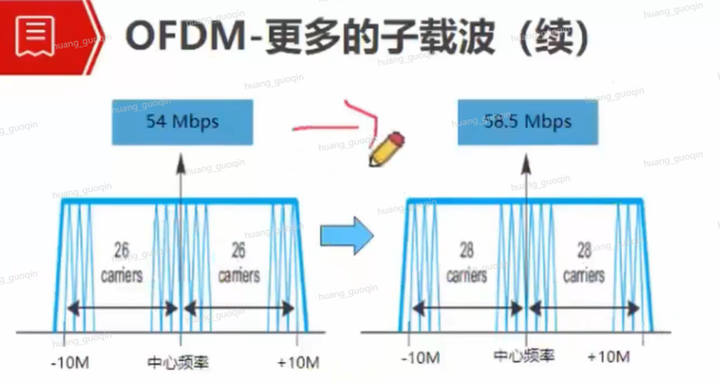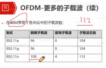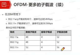 在20M带宽下, 802.11a/g子载波有48个,速率可达到54Mbps; 802.11n子载波有52个,速率可达到58.5Mbps。