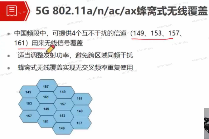 5G里美国划分得非常的宽泛,划分了二十三个信道,但是我们国内划分得比较严谨,只划分了四个信道,149、153、157和161用来无线信号覆盖,适当调整发射功率,避免跨区域同频干扰到了5G一个信道是20M带宽,一个信道号只隔5M,所以149、153、157和161信道号相互之间挨着一点,这样5G的利用率会比2.4G高一点,这个就是5G的WiFi。
