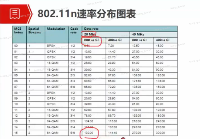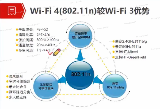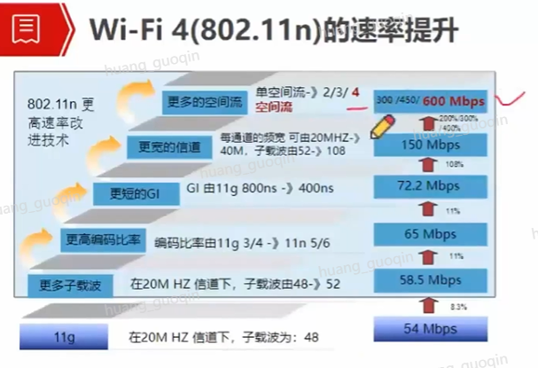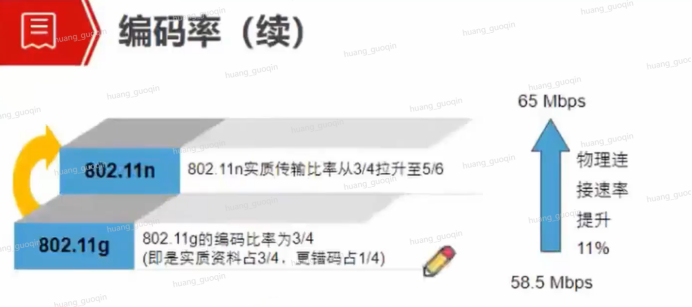 如:802.11g的码率为3/4,即有效数据占3/4,纠错码占1/4,通过物理技术,802.11n把有效数据传输比率提高,从3/4提升至5/6。