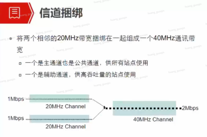 信道捆绑将两个相邻的20MHz带宽捆绑在一起组成一个40MHz通讯带宽,一个是主通道也是公共通道,供所有站点使用。一个是辅助通道,供高吞吐量的站点使用。经过信道捆绑可以大带宽增加到108个进行传数据,所以这一系列的技术使得802.11 n 的速率提升到600M。