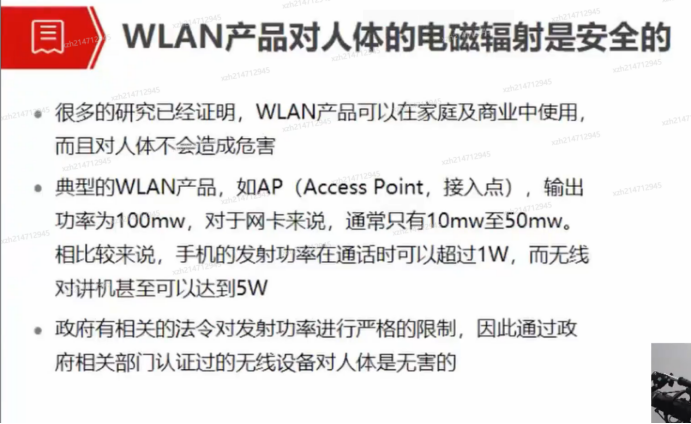 WLAN产品对人体的电磁辐射是安全的,很多的研究已经证明,WLAN产品可以在家庭及商业中使用,而且对人体不会造成危害。WiFi的发射WiFi的设备路由器最大功率是一百毫瓦,我们的基站发射功率比较大,比如说基站的4G典型是四十瓦,5G典型是两百瓦,它是面对的最后一公里的通讯是在室外的,而到了室内只需要一百毫瓦。典型的WLAN产品,如AP (Access Point,接入点),输出功率为100mw,对于网卡来说,通常只有10mw至50mw。相比较来说,手机的发射功率在通话时可以超过1W,而无线对讲机甚至可以达到5W。政府有相关的法令对发射功率进行严格的限制,因此通过政府相关部门认证过的无线设备对人体是无害的。