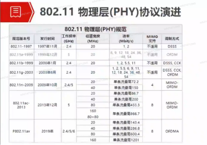 我们讲到WiFi 1到WiFi 6,常常说的是物理层的速率,也就是物理层。WiFi 1只有两兆,到了WiFi 2可以11M,WiFi 3可以54M。到了WiFi 4我们可以两个天线接收,150M,那么四个天线接收就可以600M。但是我们的WiFi设备通常是两个天线接收,峰值速率达到300M。在WiFi五速率就提升到更高了,可以达到800多M。但是它的频段和我们的802.11 a一样太高了,覆盖性能不好,所以802.11 ax WiFi 6结合2.4 G,同时美国又结合6G,它的频谱更加的宽泛,带宽一下子可以达到160M,速率得到了很大的提升。