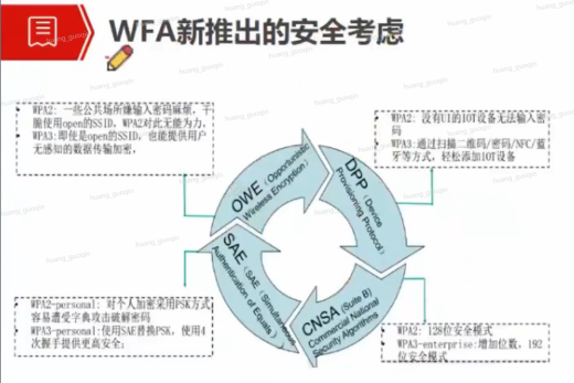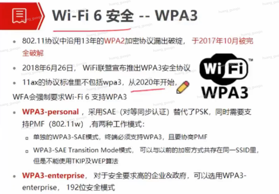 802.11协议中沿用13年的WPA2加密协议漏出破绽,于2017年10月被完全破解.2018年6月26日, WiFi联盟宣布推出WPA3安全协议。11ax的协议标准里不包括wpa3,从2020年开始,WFA会强制要求Wi-Fi 6支持WPA3。