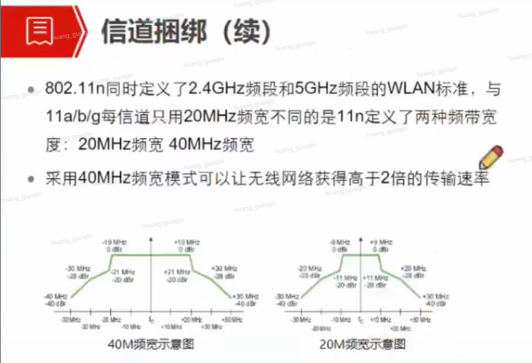 802.11n同时定义了2.4GHz频段和5GHz频段的WLAN标准,与11a/blg每信道只用20MHz频宽不同的是11n定义了两种频带宽度:20MHz频宽40MHz频宽,采用40MHz频宽模式可以让无线网络获得高于2倍的传输速率。