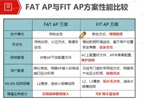 FAT AP方案技术基于传统主流,传统加密、认证方式,普通安全性。网络管理对每AP下发配置文件,用户管理类似有线,根据AP接入的有线端口区分权限,WLAN组网规模L2漫游,适合小规模组网;增值业务可以实现简单数据接入。