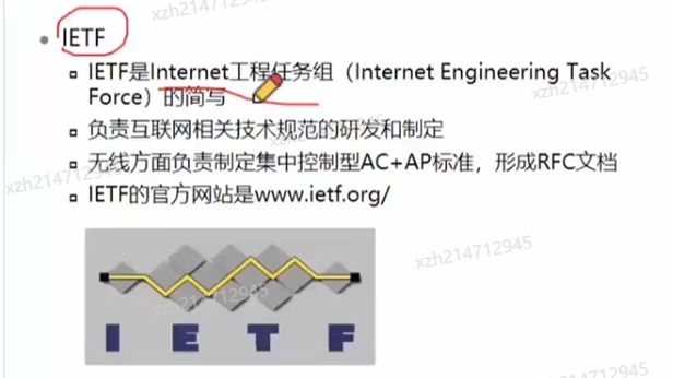 WiFi最主要的就是美国工程与定制工程师协会形成的,我们听到的internet里面的互联网是802.3,WiFi是802.11,它是互联网末端最后一百米的无线接入,IETF是Internet工程任务组(Internet Engineering TaskForce)的简写。负责互联网相关技术规范的研发和制定,无线方面负责制定集中控制型AC+AP标准,形成RFC文档IETF的官方网站是http://www.ietf.org/