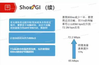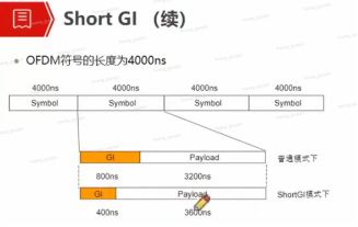 - 11n仍然缺省使用800 ns。当多径效应不严重时,可以将该间隔配置为400ns,可以将吞吐提高近10%,此技术称为Short Gl。