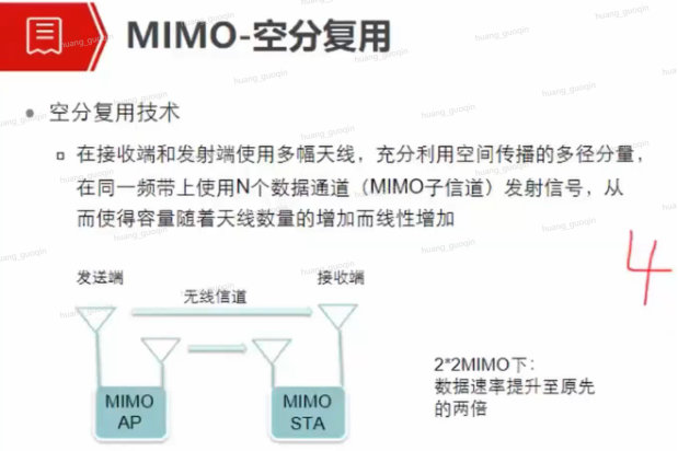 在接收端和发射端使用多幅天线,充分利用空间传播的多径分量,在同一频带上使用N个数据通道(MIMO子信道)发射信号,从而使得容量随着天线数量的增加而线性增加。2*2MIMO下,数据速率提升至原先的两倍。