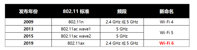 2018年10月,Wi-Fi联盟对不同Wi-Fi标准指定了新的命名,802.11ax被命名为Wi-Fi6。