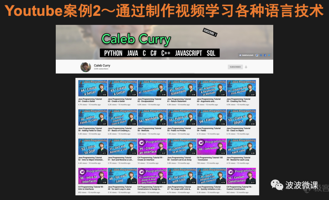 第二个例子来自一个叫Caleb Curry的美国人,他在Youtube上的频道就叫Caleb Curry,主要内容是关于编程语言学习的。Caleb学习编程语言的方式,就是每学习一种语言,就输出一门该语言的视频课程,并分享在YouTube上,也就是通过视频输出来提升学习效率。通过这种方式,经过超过6年的持续输出,他目前已经掌握了几乎所有主流的编程语言,包括Python/Java/C/C#/C++/JavaScript/SQL等。同时,他在YouTube上的视频内容也变成了他的个人资产积累。目前,他的YouTube频道有超过225k订阅,在技术领域,这个订阅量已经比较牛逼了。