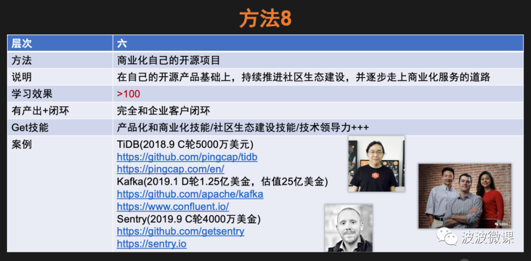 方法8指的是,在自己的开源产品的基础上,持续推进社区生态建设,并逐步走上商业化服务的道路,甚至开创一个公司。