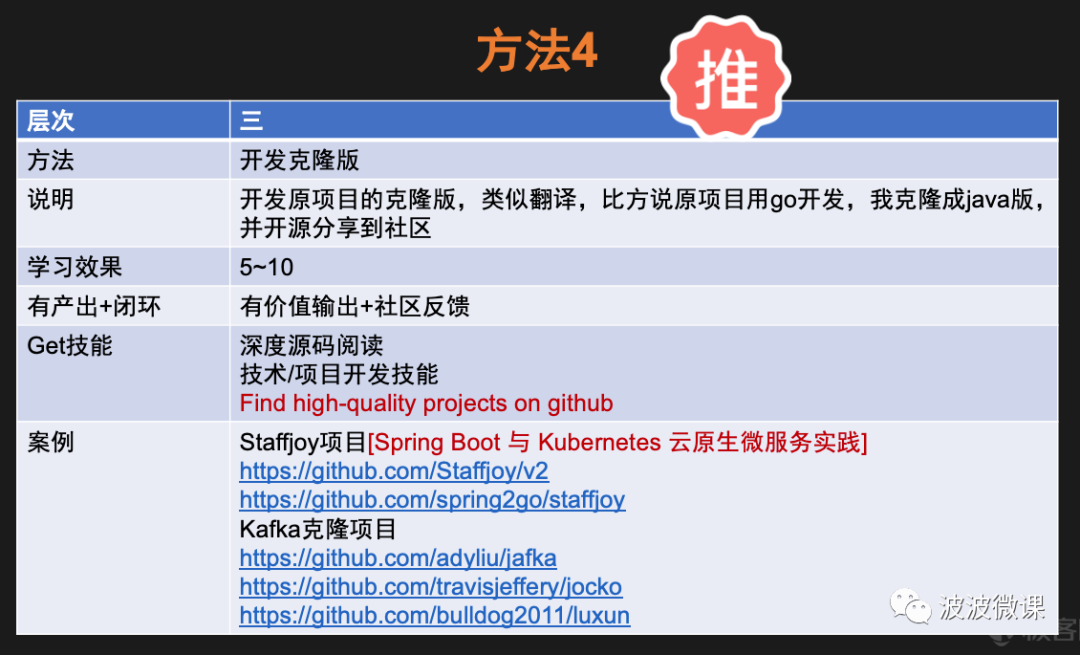 方法4也是波波使用过的方法,学习效果也很不错,当然耗费时间也更多。比方说,波波去年在极客时间上输出了一门课程《Spring Boot与Kubernetes云原生微服务实践》,为了开发这门课程,我在github上找到了一个叫Staffjoy的项目[链接见上图]。Staffjoy是一个工时排班(scheduling)应用,原来是一家创业公司的SaaS产品,后来公司关闭就把项目给开源了。这个项目是用go语言开发的,采用微服务架构,总体质量还不错(毕竟是创业公司面向企业的项目)。于是,我花了近2.5个月的时间,深入研究了这个项目的源码,并且用Java/Spring技术对这个项目进行了克隆(也适当做了调整和简化),最后开源在我的github/spring2go站点上[链接见上图]。通过这次克隆,波波不仅进一步学习了Spring和微服务等技术,同时还产出了一个课程产品,当前在极客时间上已经有超过6k的订阅量。