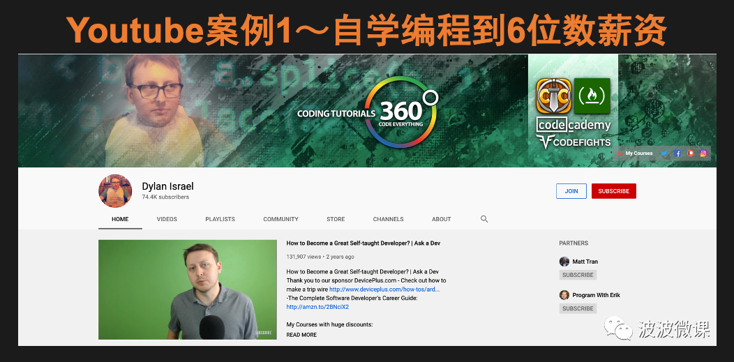 第一个例子来自一个叫Dylan Israel的美国人,他在Youtube上的频道就叫Dylan Israel,主要内容是关于如何自学编程的。他本人不是科班出身,完全通过自学编程掌握技术。他主要通过美国的Code Cademy和FreeCodeCamp等站点学习技术,每次学习一门课程或技术,他就把自己学习的过程,以live coding(现场编程)的方式,制作成视频,并分享在YouTube的个人频道上。目前他在企业上班,年薪大致在美金6位数,业余时间继续搞他的Youtube频道,既通过视频输出提升自己的技能,同时也分享编程技能。目前他的YouTube频道有74.4k订阅,也是不错的。
