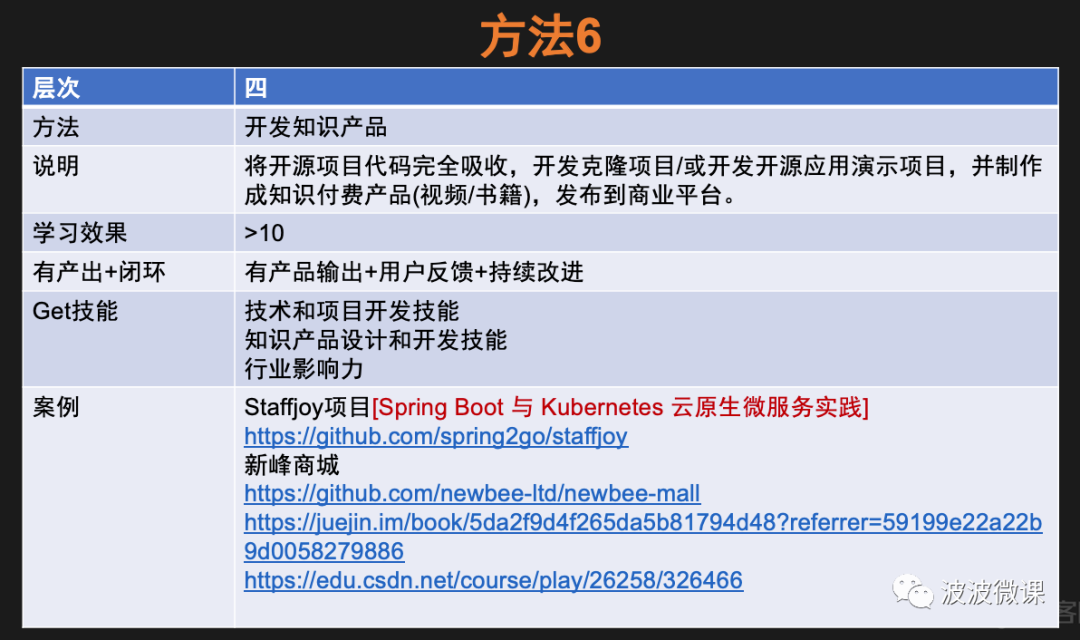 方法6是波波近年在探索的一种方法。比方说,对于前面方法4中提到的Staffjoy项目,在克隆和开源输出的基础上,我又设计和制作了一门叫《Spring Boot 与 Kubernetes 云原生微服务实践》的课程,讲解如何基于Spring Boot和Kubernetes等技术,开发一个小规模的微服务应用。这门课程已经在极客时间平台上输出。这个工作做完,波波不仅在github上分享和沉淀了一个项目(目前有超过1k星),而且还输出和沉淀了一个知识付费产品(目前有超过6k的订购)。同时,在输出的过程中,波波还初步掌握了知识付费产品的设计和开发技能,另外还初步接触了市场研究、客服,还有营销推广等技术之外的新领域。