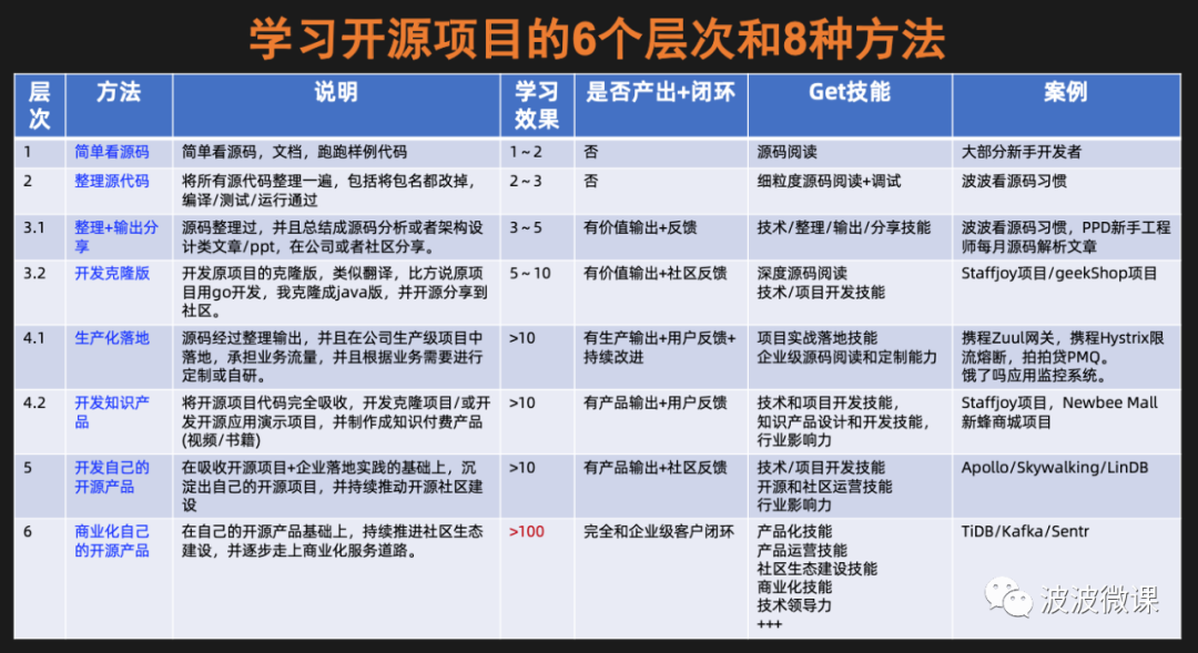 近年,波波在极客时间上输出一些技术课程,这些课程大部分都是基于开源项目开发的。输出过程中,经常有学员会问我该如何高效学习开源项目的问题。为了解答学员的疑问,基于自己这十几年来学习开源项目的经验,我总结出了学习开源项目的一个方法论。这个方法论包括6个层次和8大方法,下面是这个方法论的一个总结表格:
