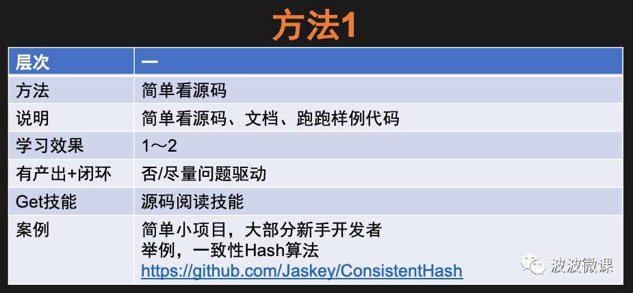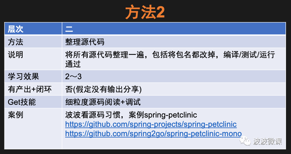 上面的表格中的内容很多,可能一下子看不明白,不用着急,波波后面会依次讲解每一种方法。而且在每一种方法中,我都会给出项目案例,其中还包括行业优秀的工程师/架构师,学习开源项目的一些方法和思路。