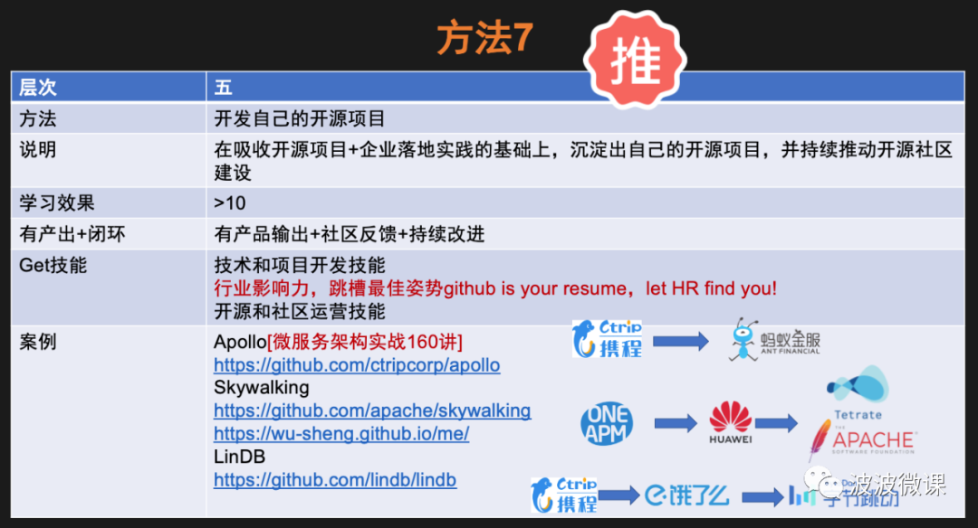 方法7指的是,在吸收开源项目+企业实践落地的基础上,沉淀出自己的开源项目,并持续推动开源社区建设。