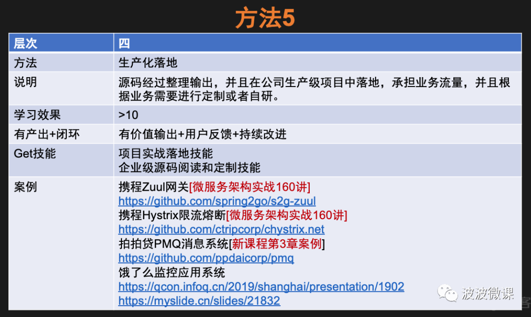 方法5的学习效果是非常好的,通过这个方法学到的东西,是在企业里头真刀真枪落地过的。一般通过企业级实战项目获得的经验,都会令你终生难忘。波波之前在企业工作的过程中,多次采用方法5,落地过很多重要项目。