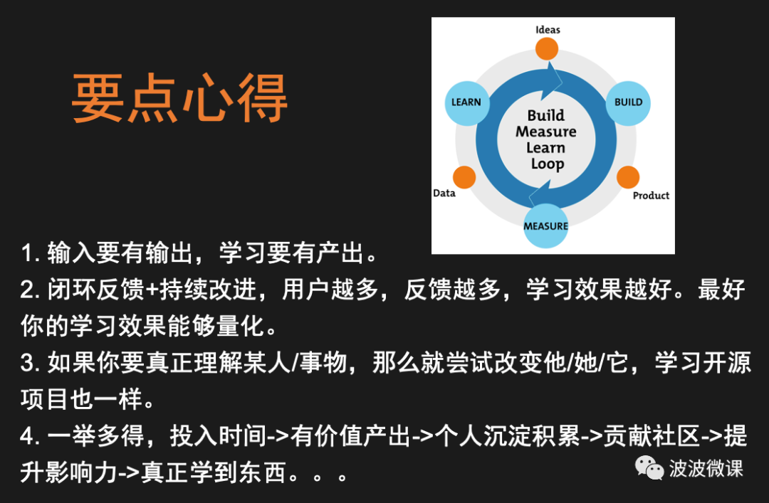 第四,大家都是学习爱好者,平时都会花大量时间进行学习。既然投入了时间,那么一定要让你的投入产生比最大化,说白了是要一举要多得。波波就是这样的,一旦下定决心投入时间精力去学习某个东西,那么一定要有价值产出,这个产出一定要变成自己的个人沉淀积累,并且这个产出最好要能贡献社区(对社区有价值),然后能提升自己的影响力,最后能真正的学到东西。当你养成以投入产出比的视角去看待学习以后,你就会对你的学习投入慎之又慎,不会轻易投入价值小的学习方式。