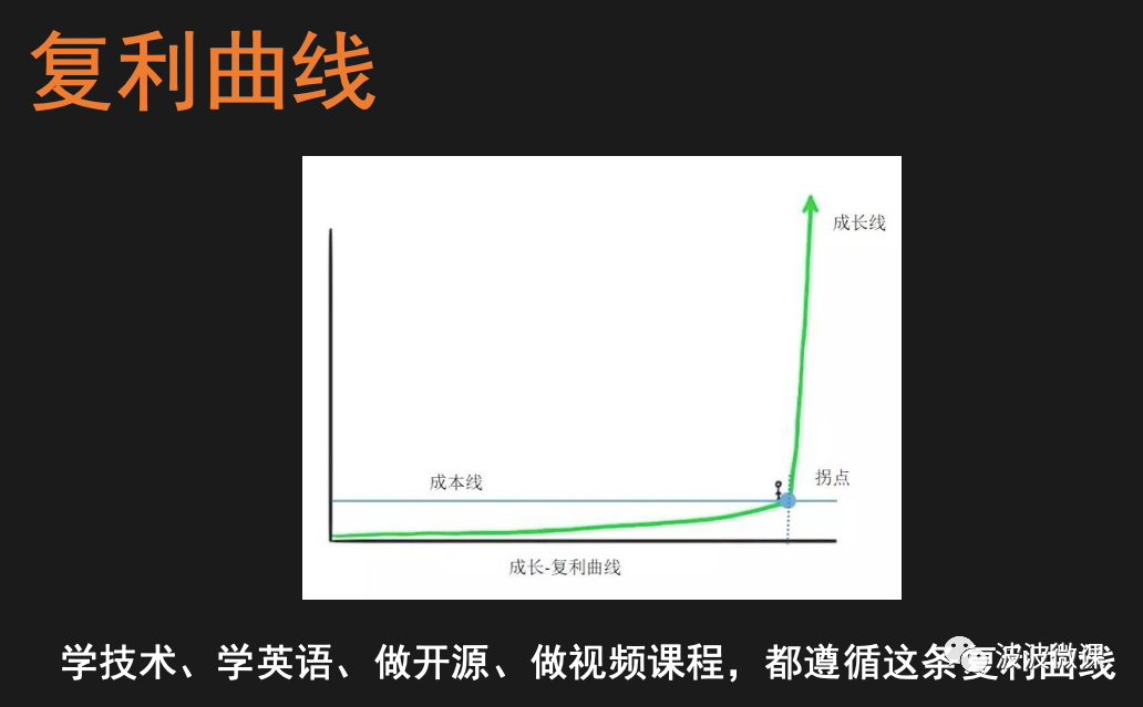 最后要强调一点,不管是学技术,学英语,做开源,还是做视频课程,都遵循所谓的复利曲线,如上图所示。在复利曲线的底部,成本线以下的那条成长线很平很长,只有到达拐点,成长线才会呈指数级上升。比方说,波波投入技术领域已经超过15年,只是在最近几年,才隐约感觉快到拐点附近了。另外波波发现,在YouTube上做视频输出的比较成功的大V,平均积累周期是5~6年,才会出现拐点,订阅量呈现快速增长。对于方法8提到的从开源到商业公司的案例,底部的成长线更长,一般周期需要超过10,才可能盈利甚至上市。