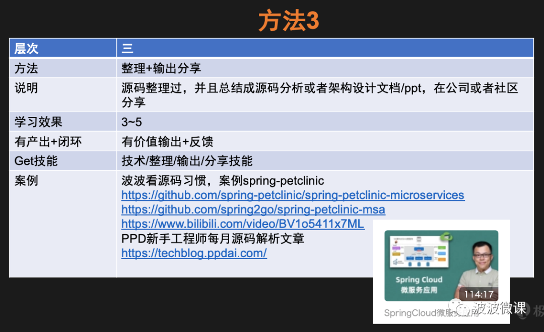 方法3也是波波阅读开源项目代码的习惯,之前在企业是这样,现在做课程输出也是这样。举个例子,波波前段时间要重温一下Spring Cloud微服务技术栈,于是我就在github上找到一个叫spring-petclinic-microservices的项目[链接见上图],它是spring-petclinic项目的微服务版。为了深入学习这个项目,我先用方法2,把整个项目的源码整理了一遍,并输出在我的github/spring2go站点上[链接见上图]。然后,我自己录制了一个视频课程,名称《Spring Cloud微服务应用》,并且把整个视频分享在我的B站空间上[链接见上图]。这个工作做完,我不仅加深了对Spring Cloud相关技术栈和框架的理解,同时还产出了两样东西,一个项目源码+一个视频课程,这两样东西最后变成了我的个人积累和沉淀。