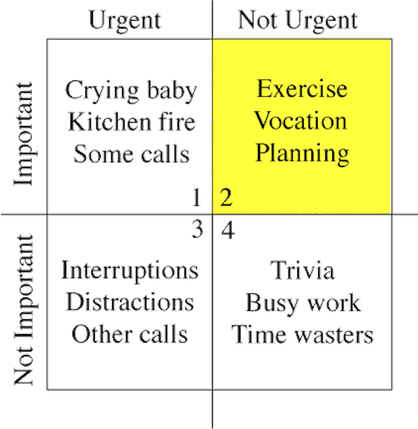 听起来似乎完全没毛病?让我们来仔细看看Stephen Covey提出的时间四象限法则(time-management matrix):