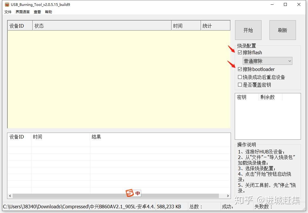 (1):电脑端运行刷机工具,单击菜单项‘文件’→ 导入烧录包 → 选择下载好的刷机包(中兴B860AV2.1_905L-安卓4.4.2-线刷包固件-20200131版.img),导入烧录包后默认是选中了‘擦除flash’和‘擦除bootloader’这二个配置的。