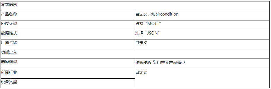 (5)在功能定义页面,选择“自定义功能”,参考下表,完成产品模型配置。
