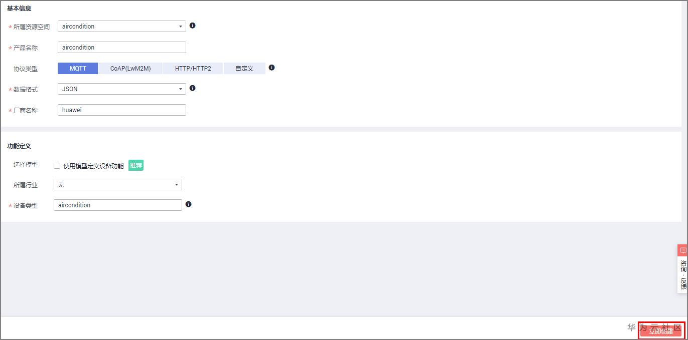 (4)单击右上角的“创建产品”,创建恒温空调产品,填写参数后,点击“立即创建”。