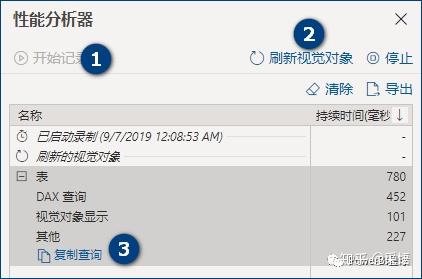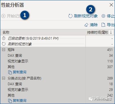 然后点击开始记录并刷新视觉对象,就可以看出每个元素耗费的时间,如下图,