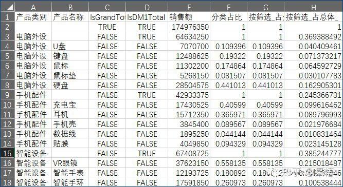 不仅有明细数据,还有汇总数据,并且自动增加了两列,来标识本行是否为总计行/小计行。