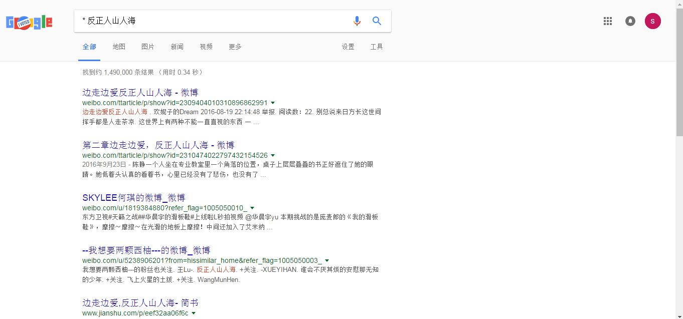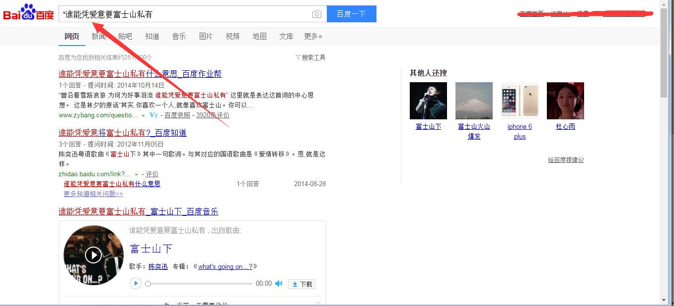 这也是一个比较常用的搜索方法,通常通配符搜索,用在模糊印象的地方比较多。当我想搜一句歌词,边走边爱,反正人山人海 但是前边的 边走边爱,就可以用这个方法进行搜索了。搜索* 反正人山人海