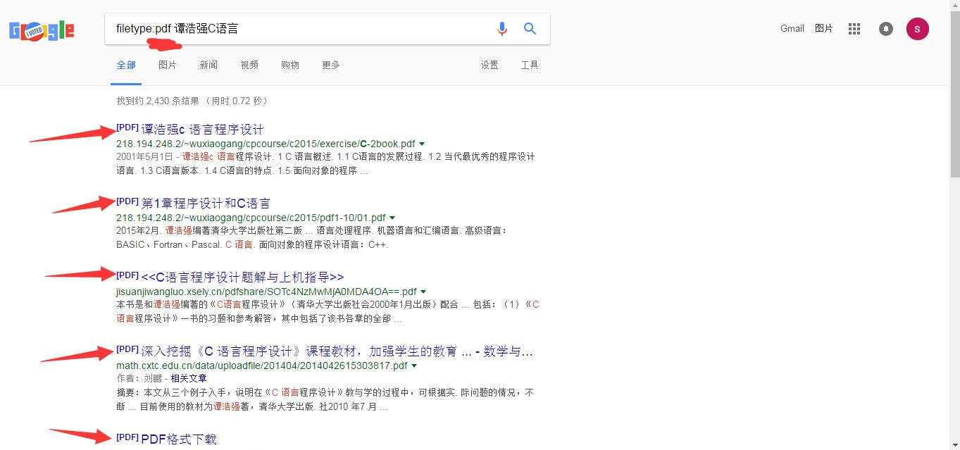 百度的文档搜索,也是这个命令: filetype:pdf 谭浩强C语言 ,不过相对谷歌而已,百度的搜索是把自己的产品,放在前面,见图,排在前面的都是百度自己的产品,百度文库