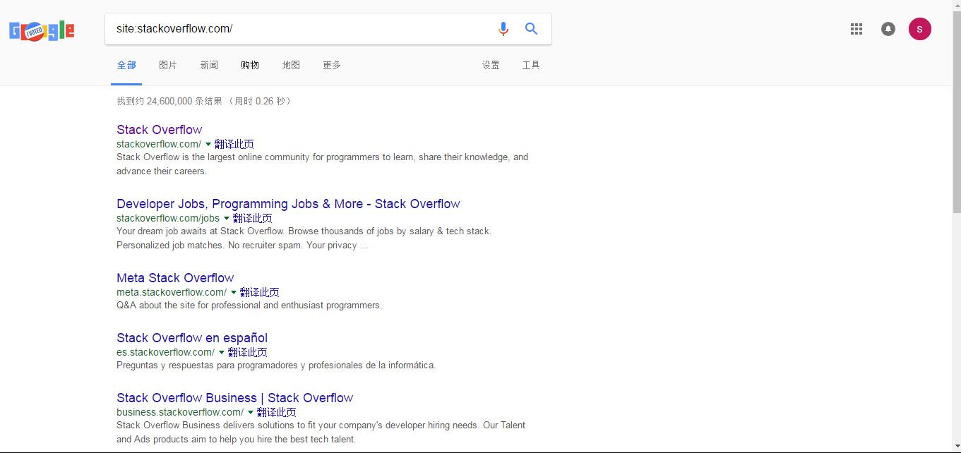 这是一个比较常用的搜索方法,site 搜索,就是在站内进行搜索,语法是:site:http://stackoverflow.com/ 中 site:后面加上你要搜索的网站地址。一般程序猿解决问题,用site:http://stackoverflow.com/,大部分解决不了的问题,都会有答案了。