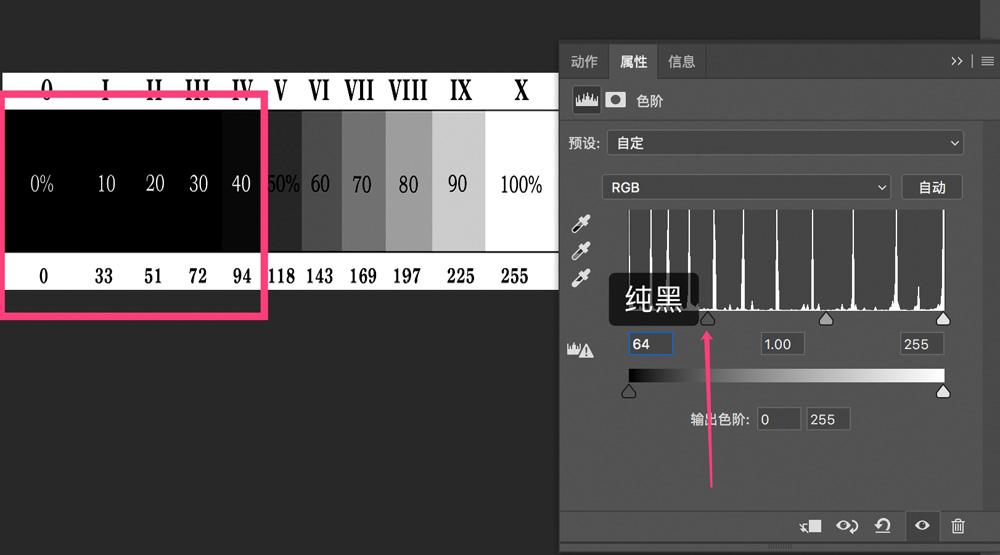 下图中我把黑色滑块右移到数值显示64的位置。意味着原图亮度小于64的深灰色区域,现在都变成了纯黑色。