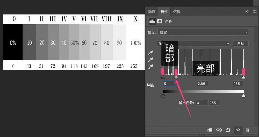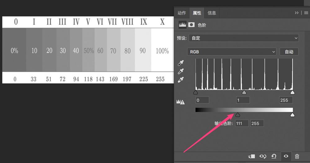 我在调整色阶工具的时候,大家可以很直观的看到灰度图片各个亮度区域的变化。
