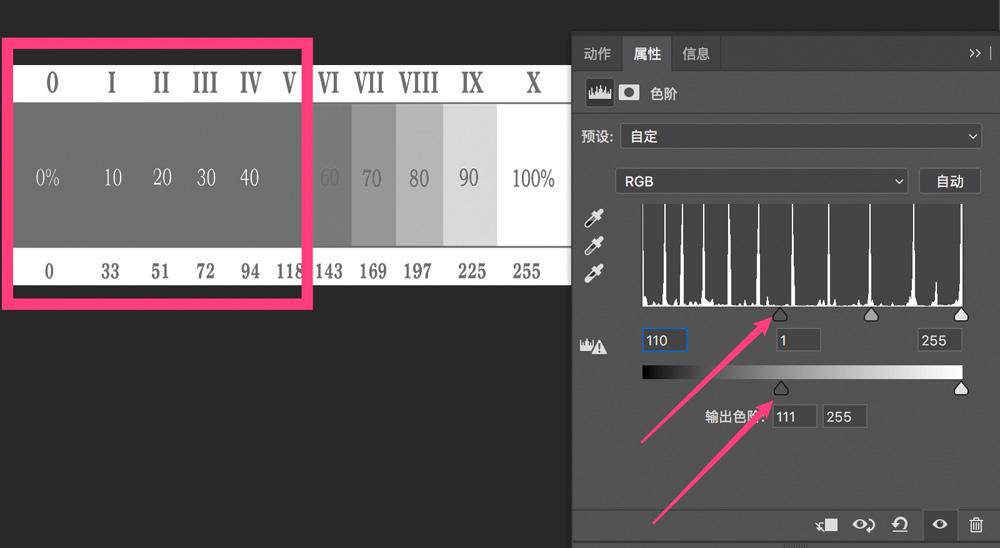 但是现在还移动了输出色阶下限,导致画面中最暗的地方也要有111的亮度。因此I、II、III、IV作为照片中新的最暗区域,只能达到111的灰色亮度。