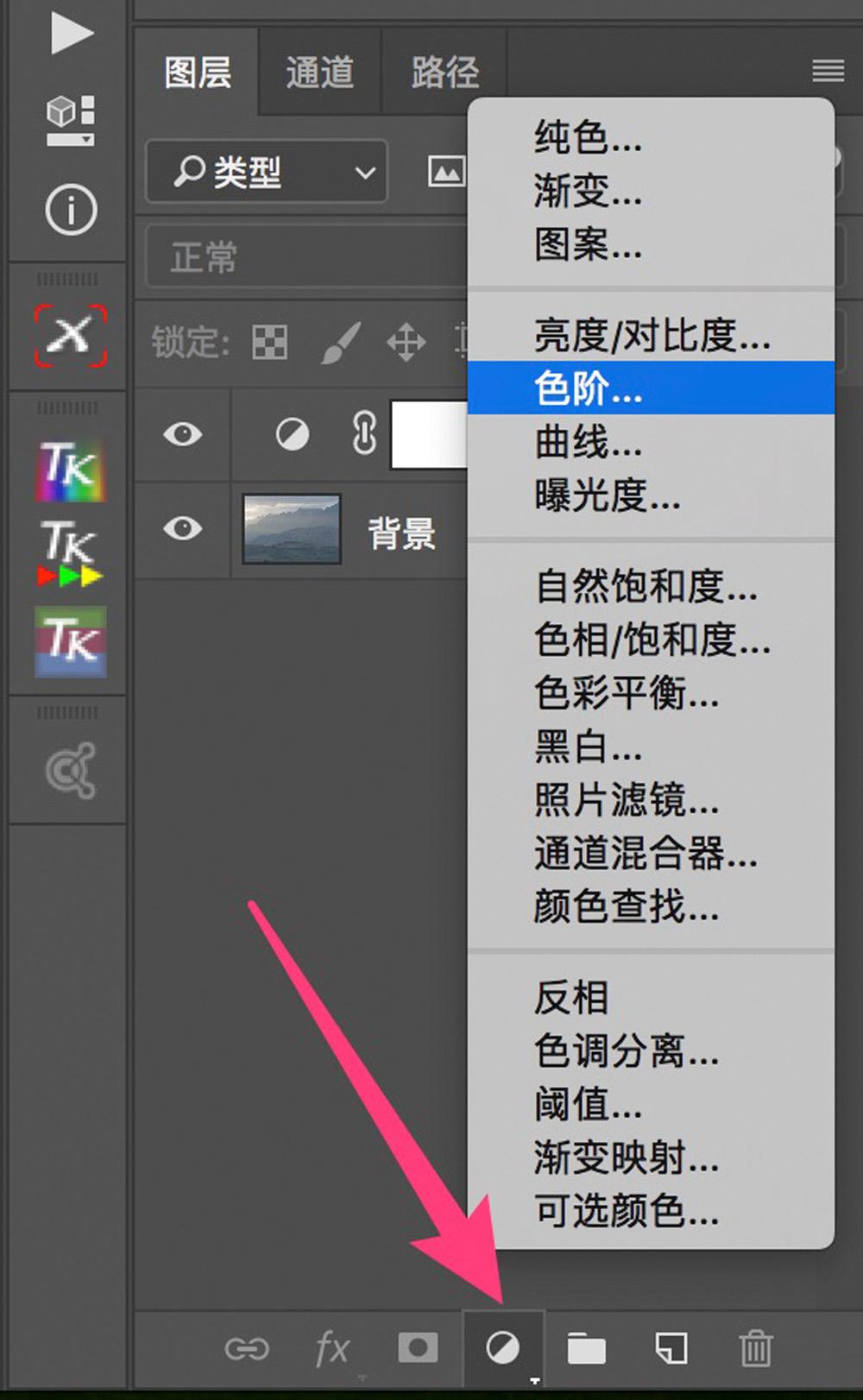图层面板下方的第四个图标,包括了所有的调整图层选项。鼠标单击该图标,然后选择“色阶”,就可以新建一个色阶调整图层了。