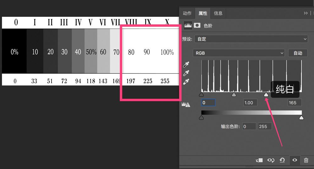 如果输出色阶不动,调整白色滑块,白色滑块右侧的亮度区域,都会变成亮度255的纯白色。其他区域,亮度则会不同比例的提高。