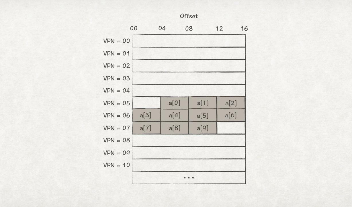 接下来,我们再次重新遍历一次数组,由于经过上一次之后Page 5 ~ Page 7的转换信息已经在TLB缓存里里,所以第二次遍历的TLB命中情况为:Hit,Hit,Hit,Hit,Hit,Hit,Hit,Hit,Hit,Hit,TLB缓存命中率为100%!这就是时间局部性的原理,短时间内访问同一内存数据也能够提升TLB缓存命中率。