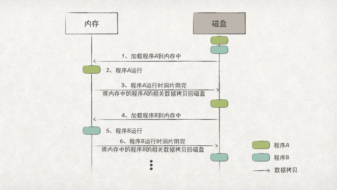 在多任务系统中,计算机系统已经可以做到多个任务并发运行。如果还是按照独占式的管理方式,那么每次任务切换时,都会涉及多次内存和磁盘之间的数据拷贝,效率极其低下: